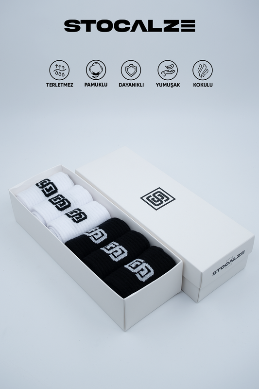 Stocalze Unisex Siyah ve Beyaz Tenis Çorabı. 6'lı Kutulu Stocalze Logulu Kolej Çorap.