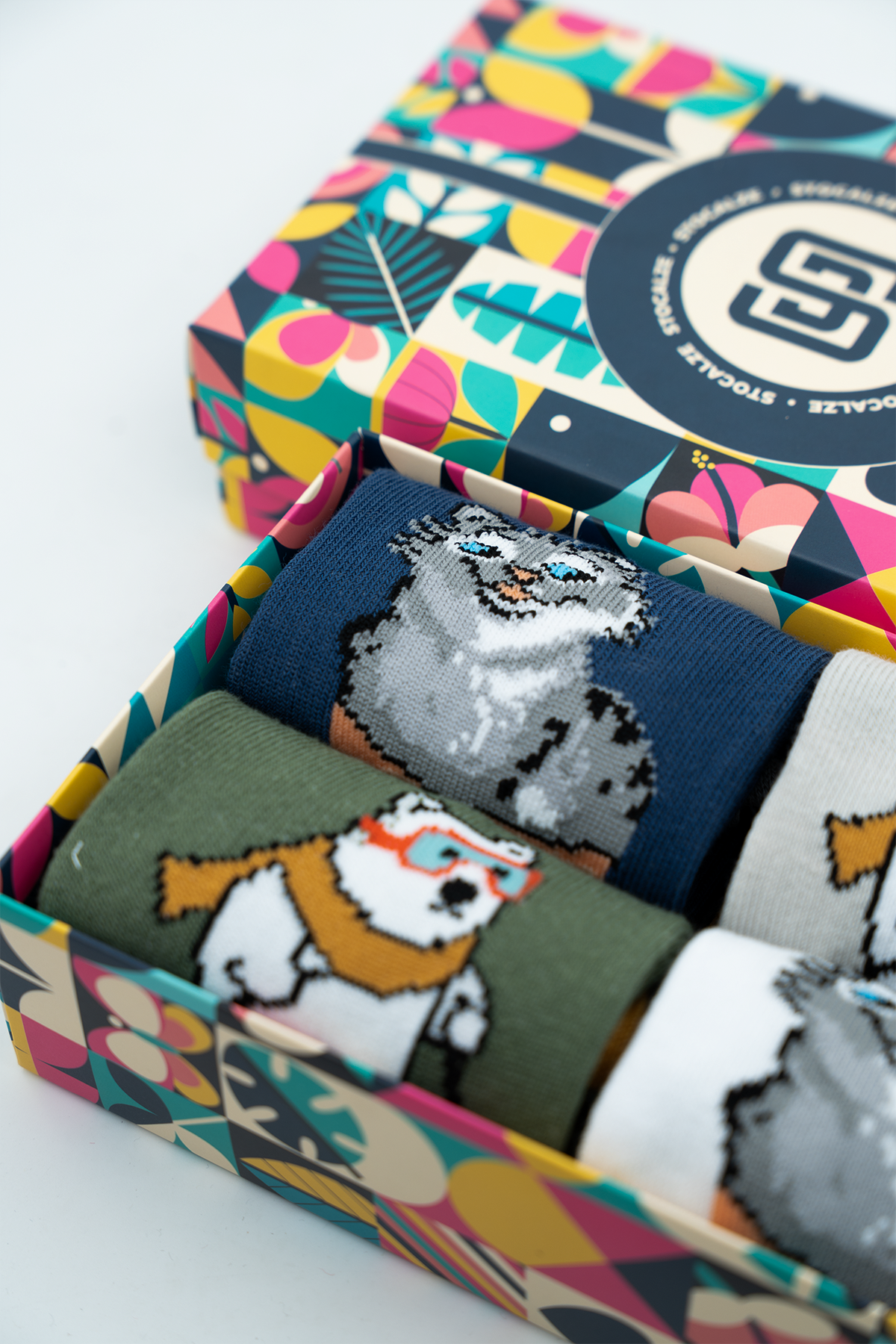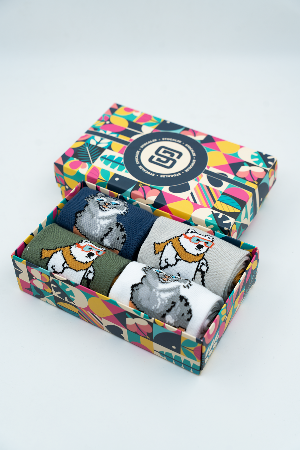 Stocalze Unisex Desenli Soket Çorap Seti (4’lü Kutu) – Sevimli Kedi ve Kayak Yapan Kutup Ayısı Tasarımlarıyla Eğlence ve Konfor Bir Arada!